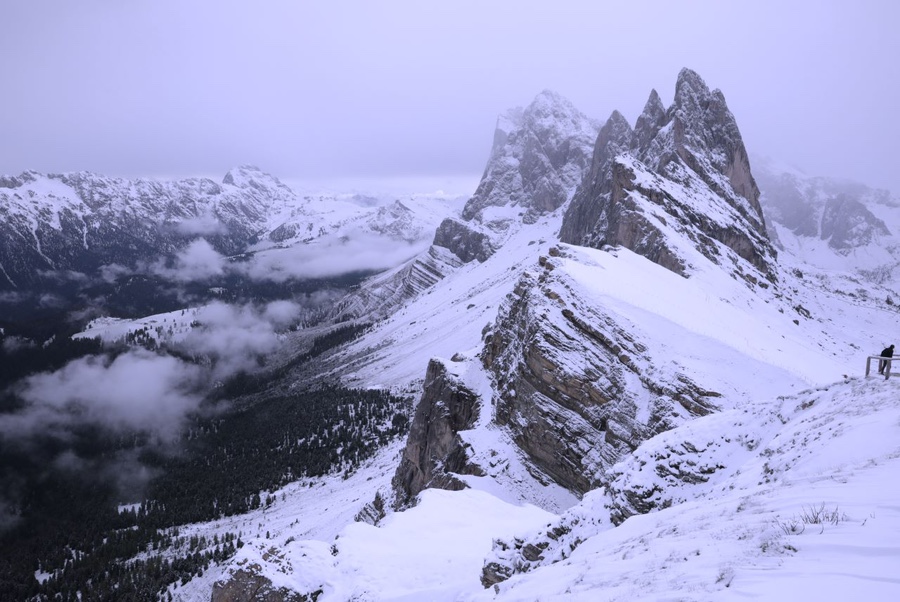 돌로미티의 상징이자 하이라이트인 트레 치메 디 라바레도는 겨울에 접근이 쉽지 않지만, 전문 가이드의 도움으로 그 웅장한 위용을 가까이서 만날 수 있었습니다. 눈과 얼음으로 뒤덮인 세 개의 거대한 봉우리는 압도적인 존재감을 드러냈고, 순백의 대자연 속에서 저는 말할 수 없는 경외감을 느꼈습니다. 그야말로 겨울 왕국의 심장부에 들어온 듯한 경험이었어요. 거친 바람과 차가운 공기 속에서도, 이 비현실적인 아름다움은 그 모든 어려움을 잊게 할 만큼 강렬했습니다.