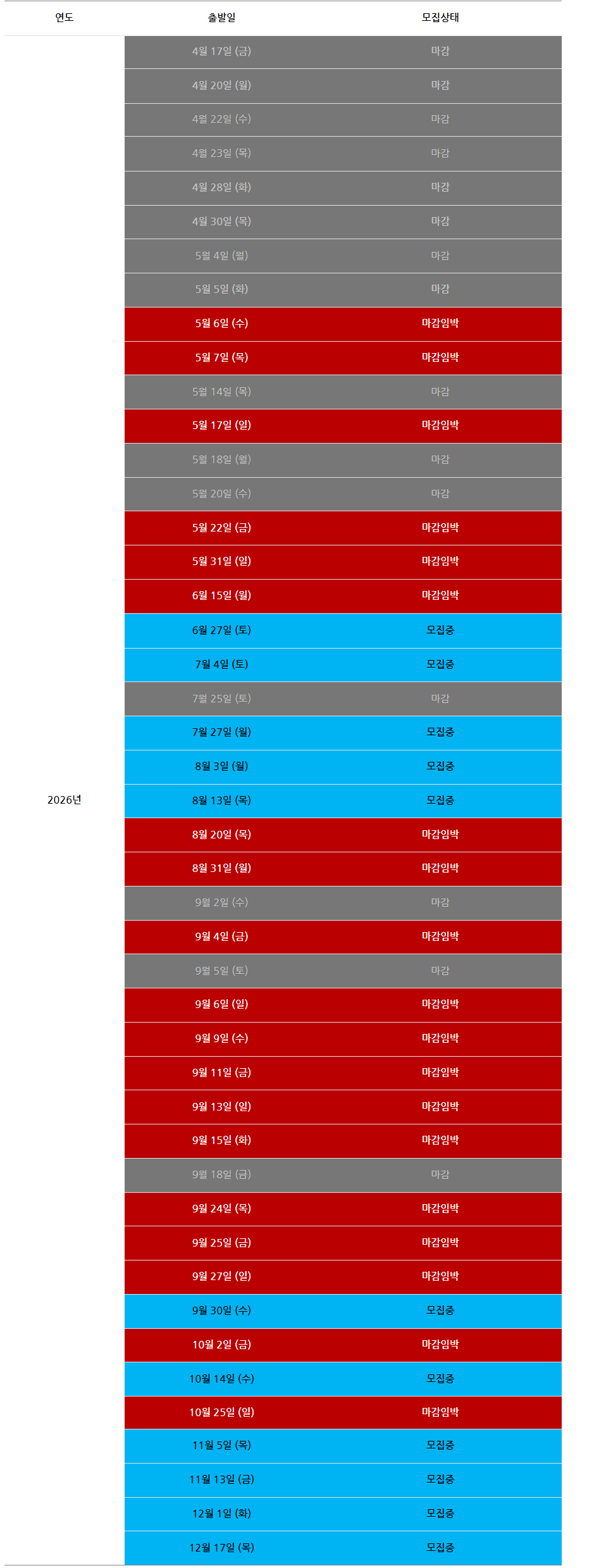 | 출발일자 | 모집상태 | 비고 |