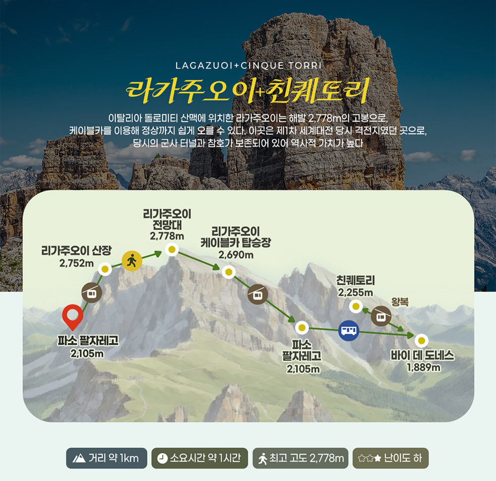 체력 부담은 줄이고 돌로미티의 대표 풍경은 충분히 즐길 수 있습니다.